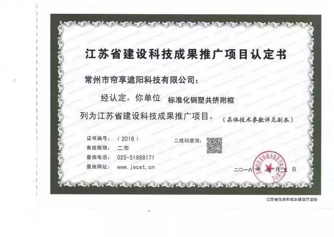 常州市簾享遮陽(yáng)科技有限公司,坐落于常州市雪堰鎮(zhèn)南宅工業(yè)園區(qū),簾享遮陽(yáng)企業(yè)專注于外遮陽(yáng)、外遮陽(yáng)卷簾窗、建筑外遮陽(yáng)、卷簾窗、歐式卷簾窗、副框、門窗副框、附框、門窗附框、門窗、門窗五金等系列產(chǎn)品的生產(chǎn)、銷售和服務(wù)。工廠擁有完善的簾片自動(dòng)生產(chǎn)線,八角管自動(dòng)生產(chǎn)線、窗罩成型自動(dòng)生產(chǎn)線和專用的五金配件和塑料制品生產(chǎn)線。簾享所生產(chǎn)的附框?yàn)殇撍芄矓D附框,在江蘇省住建廳的總指導(dǎo)方針下,進(jìn)行了創(chuàng)新,實(shí)現(xiàn)了對(duì)鋼的全包裹覆蓋,融合了鋼附框和木塑附框的優(yōu)點(diǎn),即保證了安全,又實(shí)現(xiàn)了真正意義上的節(jié)能,受到了業(yè)界的一直認(rèn)同與好評(píng)。公司擁有多項(xiàng)鋼塑共擠門窗附框的外型及生產(chǎn)工藝的專利。